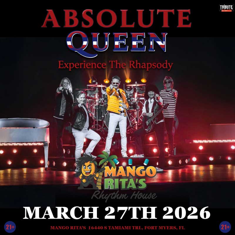 Purchase tickets Here! Must be 21 to enter. Doors Open at 6:30 PM. Come early and enjoy mouth watering food and cold drinks at Mango Rita’s Rhythm House served by the best and friendliest staff in the business. ABSOLUTE QUEEN delivers authentic, high-energy experiences that rival the magic of seeing Queen live, with note-perfect renditions of iconic hits, incredible multi-layered vocal harmonies, precise instrumentation, and powerful musicianship.