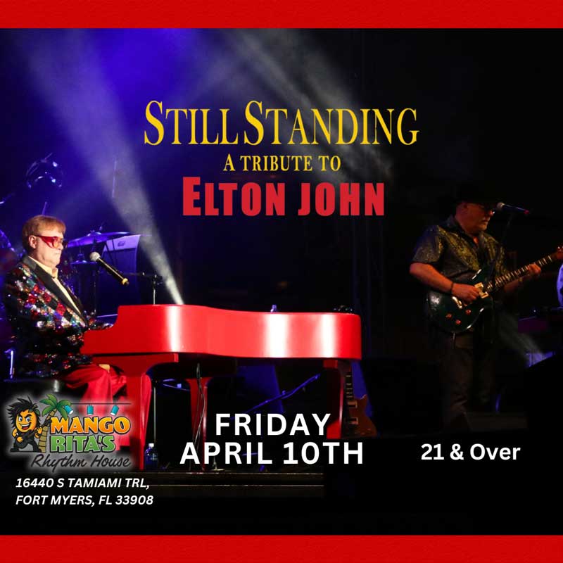 Purchase tickets Here! Must be 21 to enter. Doors Open at 6:00 PM. Come early and enjoy mouth watering food and cold drinks at Mango Rita’s Rhythm House served by the best and friendliest staff in the business. STILL STANDING is the ultimate visual and musical Elton John Tribute event bringing all the timeless classics performed to the detail that Elton John’s music deserves.